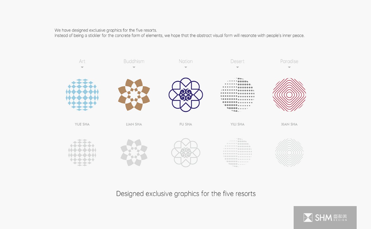 The pure white color system and the exclusive graphics for each area convey the design concept of "preserving a pure land for you" in the desert. We have designed exclusive graphics for the five resorts. Instead of being a stickler for the concrete form of elements, we hope that the abstract visual form will resonate with people's inner peace.