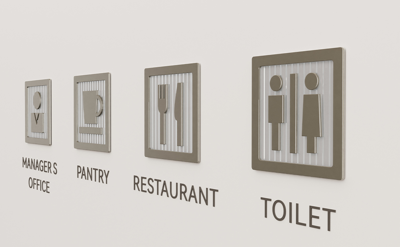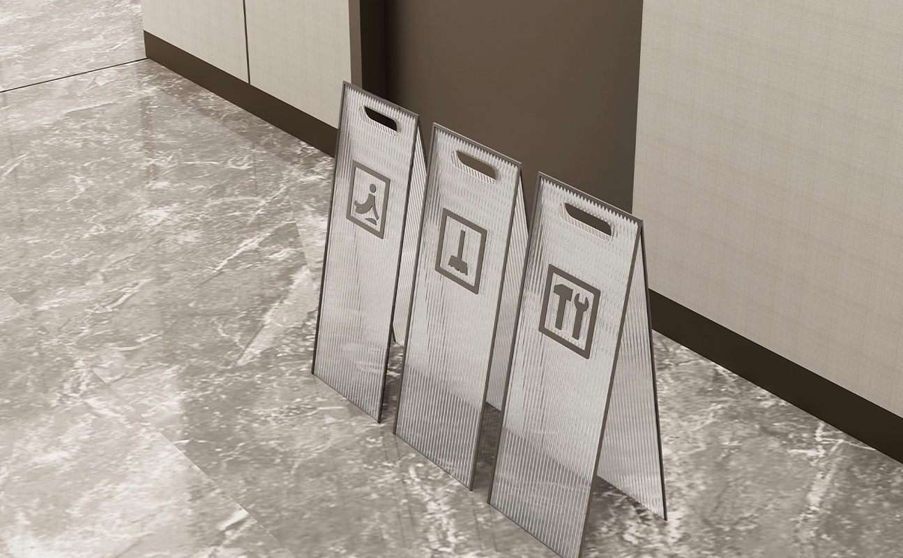 整套标识系统采用极简风,秉承“大道至简”的理念,蕴含中庸和谐的视觉美感,摒弃复杂繁琐,追求宁静而雅致,该设计反映了对简约生活的向往。此外,设计中采用了带有“浅宋韵”的纵向条纹,不仅在现代简约的风格中突出了企业的稳重感,也传达了对东方美学的致敬。为了达到图标与标识牌体的和谐共生,我们为此进行了专属icon的平面设计, 这些图标既方正又圆润,既稳重又不失细腻,传递出新时代的办公美学与视觉体验。
