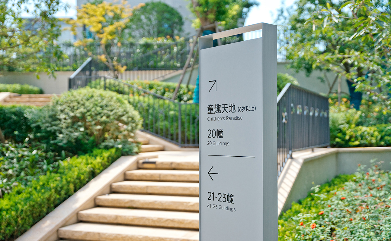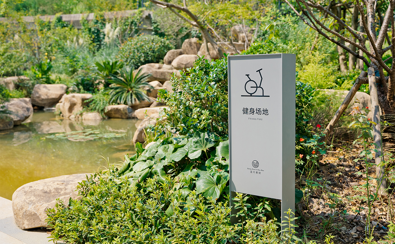 根据蓝月春晓静谧、安逸的环境特性,在此次导视设计上充分保留了原生的自然基底。叠合人与自然、自然与建筑的影像,以渗透融合的设计手法,打造宜居的生态空间。通过导视对整体空间的拼合,将人们生活中的细节融合在环境之中,形成一个静谧、舒适的居住环境。