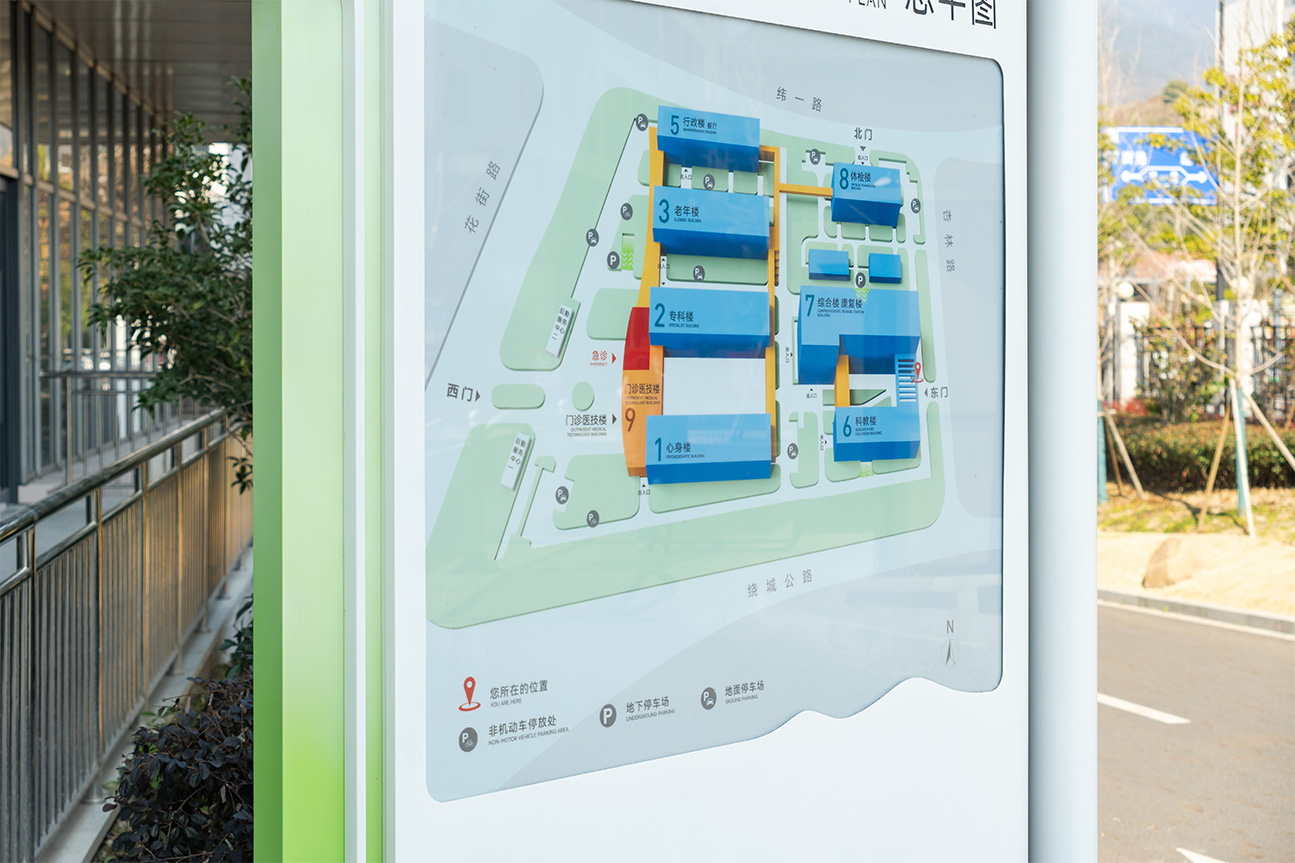The overall wayfinding system solution design draws on the poetic lines in the mountains and waters, integrates the Eastern Zen culture, and presents it in a simple artistic form, conveying tranquility and hope in silence. The design adheres to the concept of "embracing nature and caring for life", drawing on the natural vitality of Baiyun Mountain and integrating the beauty of mountain forests and clouds into it. Integrating local cultural characteristics, using natural imagery to convey warm comfort, and creating a medical guidance system that is full of vitality and cultural heritage.