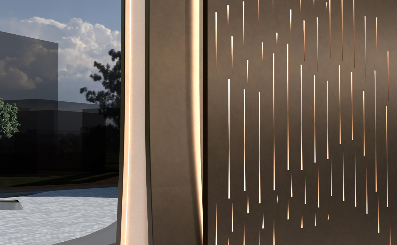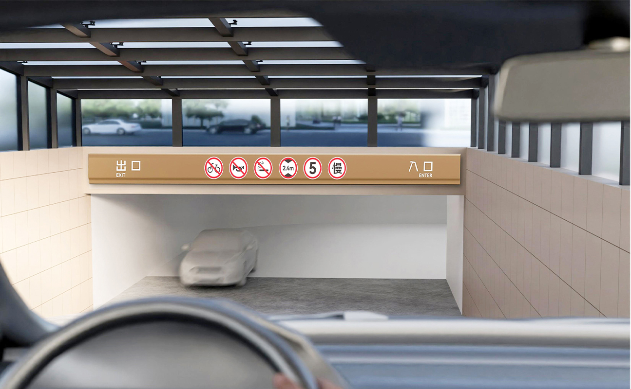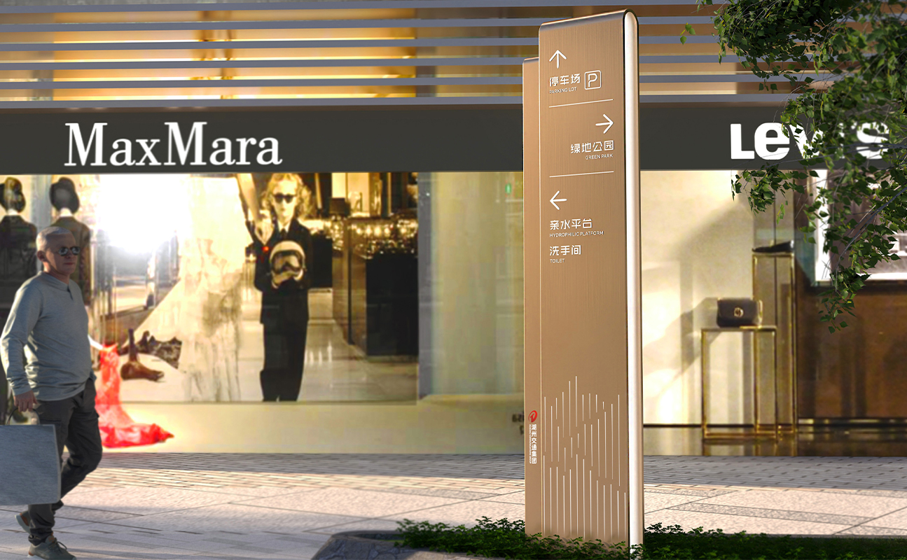 In the process of designing the wayfinding system, Shenghemei integrated the architectural design concept with Huzhou's distinctive silk and Hu brush culture. Through smooth and interwoven lines on the facades and volumes, it presents the agility and three-dimensional beauty of silk, creating a lingering artistic conception in the overall shape. Soft silk and graceful flowing water elements endow the wayfinding system with a fashionable and romantic vibe, while the visual imagery adds a touch of scholarly elegance. Thus, it shapes the image of a waterfront golden street that embodies both cultural connotations and modern aesthetics.