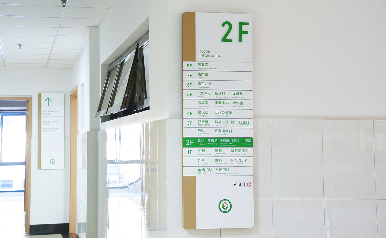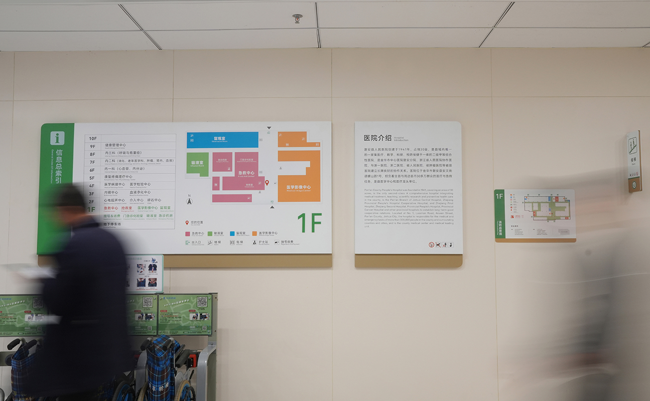 In the design of the wayfinding system, we adopt a simple and lightweight approach to create a clear and soft visual hierarchy. The design incorporates the natural imagery of Pan'an – "surrounded by mountains on three sides and bordering water on one side" – into its form. By using wooden materials and building a green medical space, we shorten the distance between humans and nature. The simple and gentle texture reflected in every detail helps create a warm, soothing and healing atmosphere for the medical environment.