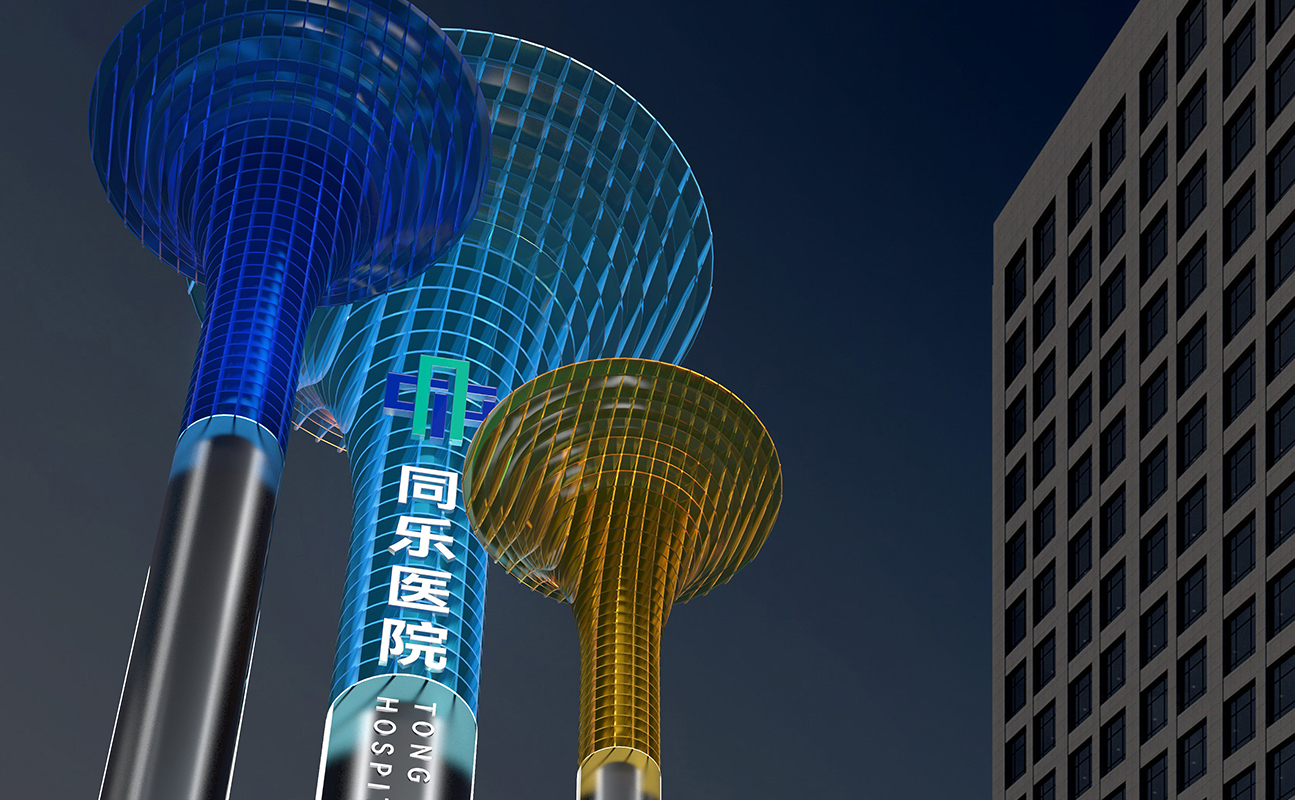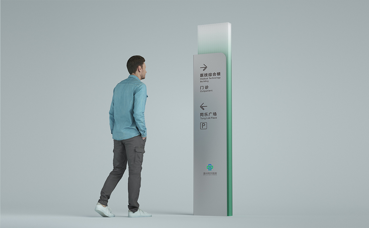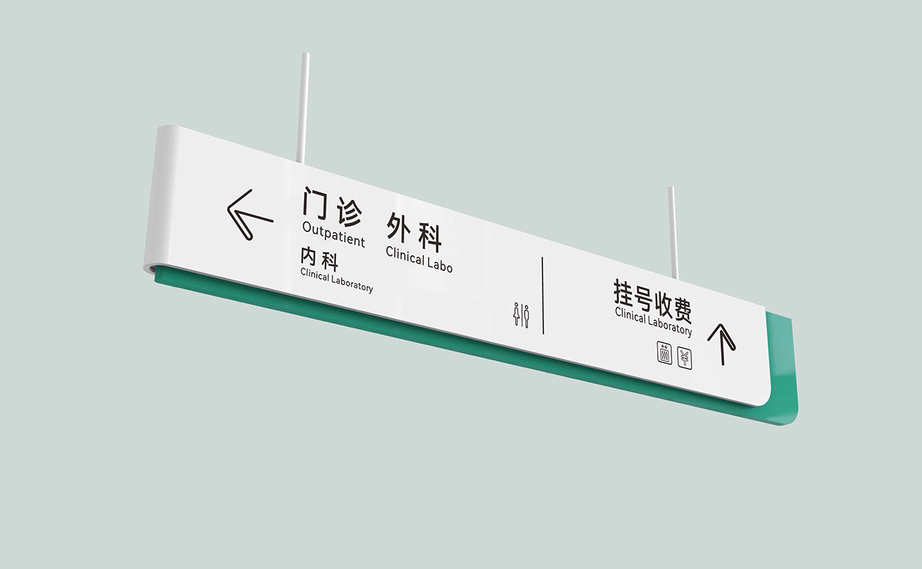 导视系统选用通透卡乐板双层造型,内容可更换,灵活适应科室调整。核心形象立招设计独特,打破传统形式,兼具辨识度与装饰性,并贯彻“指示小品化、小品指示化”理念,与景观自然融合。整体以简洁线条营造安静通透的环境,体现精致、温馨、友善的文化,兼顾实用性与体验感。